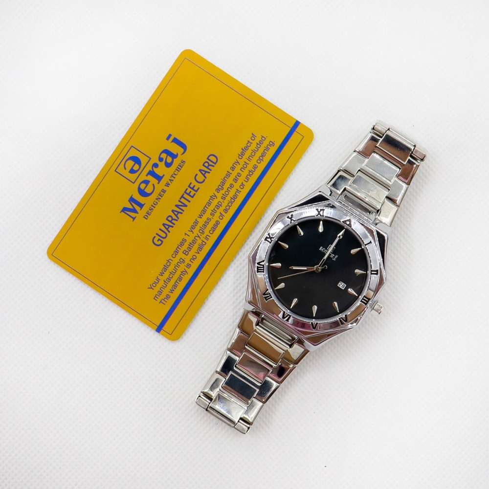 ساعة رجاليه بسير من الستانلس ستيل باللون الفضى ، تتميز الساعة بميناء واسع فريد وبإطار بارز باللون الاسود ، لتتفرد بإطلالتك في كل الأوقات ببساطه وأناقه .